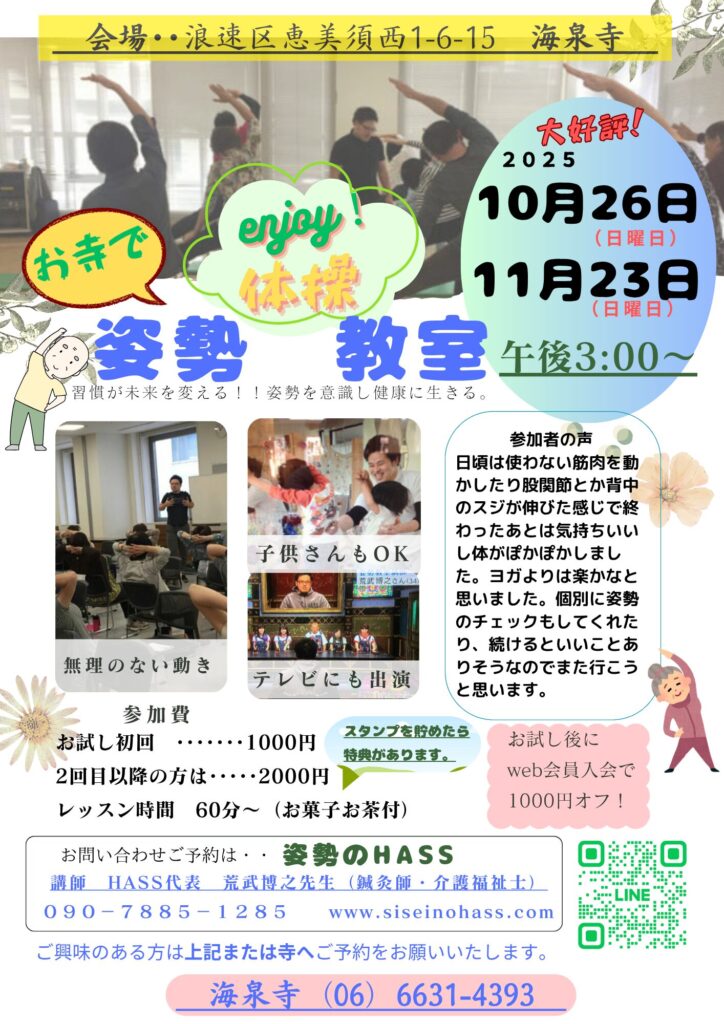 2025年11月23日(日曜日)15時からお寺でエンジョイ体操 姿勢教室が開催されます。参加希望の方は直接姿勢のHASS荒武先生に申込するか海泉寺まで連絡ください。090-7885-1285(姿勢のHASS荒武博之先生)